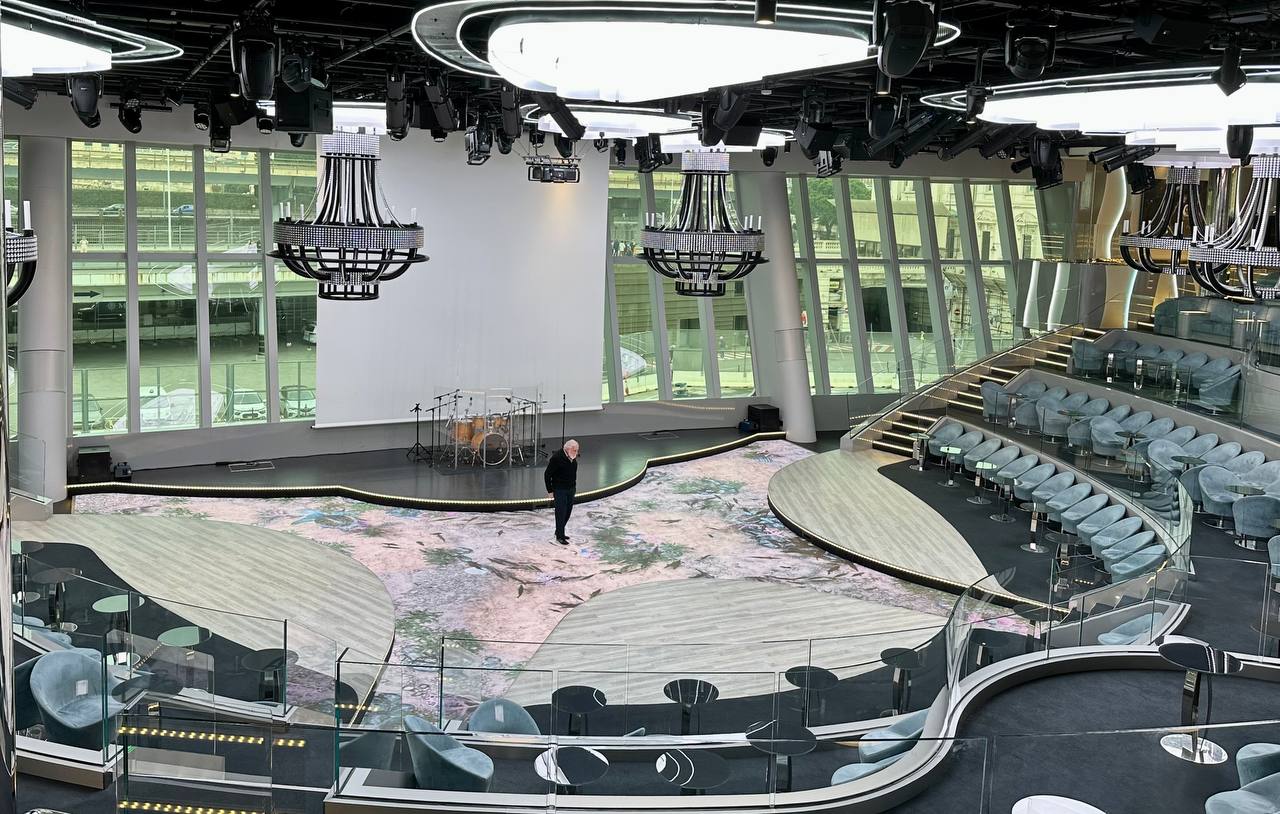 Qui, il grande schermo LED crea atmosfere sempre diverse con giochi di luce che trasformano lo spazio in un’esperienza immersiva.
