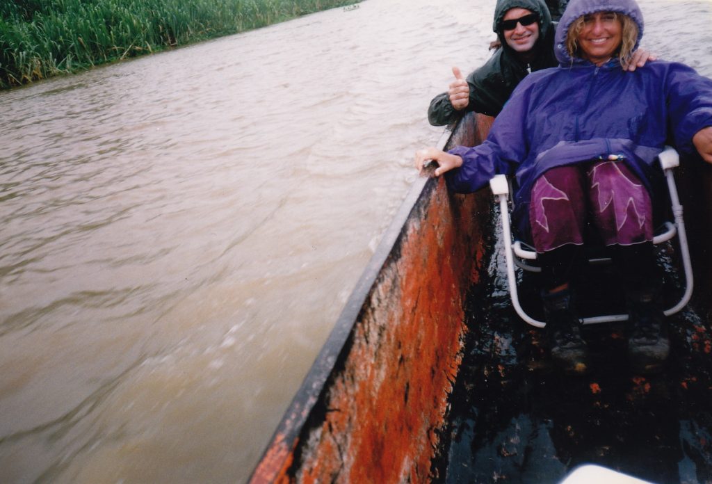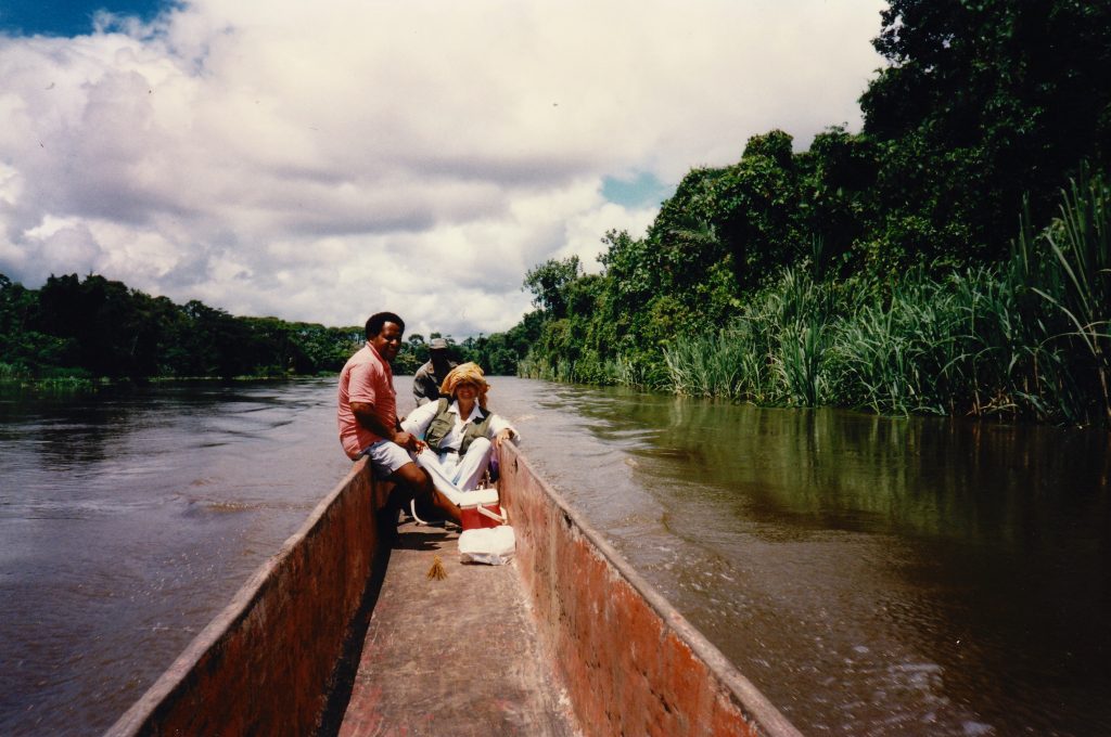 Ma che emozione la partenza! La canoa lunghissima filava contro corrente a tratti veloce e a tratti lenta, frenata dalla vegetazione del fiume. Le ninfee violette circondavano la barca e bisognava spingere con lunghi bastoni per avanzare. Lungo il fiume vedevamo le palafitte dei villaggi animate da bambini e animali, mentre la sensazione di entrare in un mondo allo stesso tempo nuovo e primitivo si faceva fortissima e sconvolgente. Ogni poco scrosci di pioggia ci inzuppavano fino alle ossa, poi il sole ci scottava la pelle, il naso e le mani aggrappate ai bordi della canoa.
